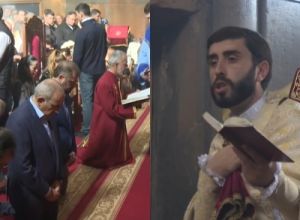 Իրեն ժողովրդի հետ նույնացնող Փաշինյանի անվտանգության աշխատակիցը մեջքով դեպի խորանը կանգնած է մասնակցում պատարագին